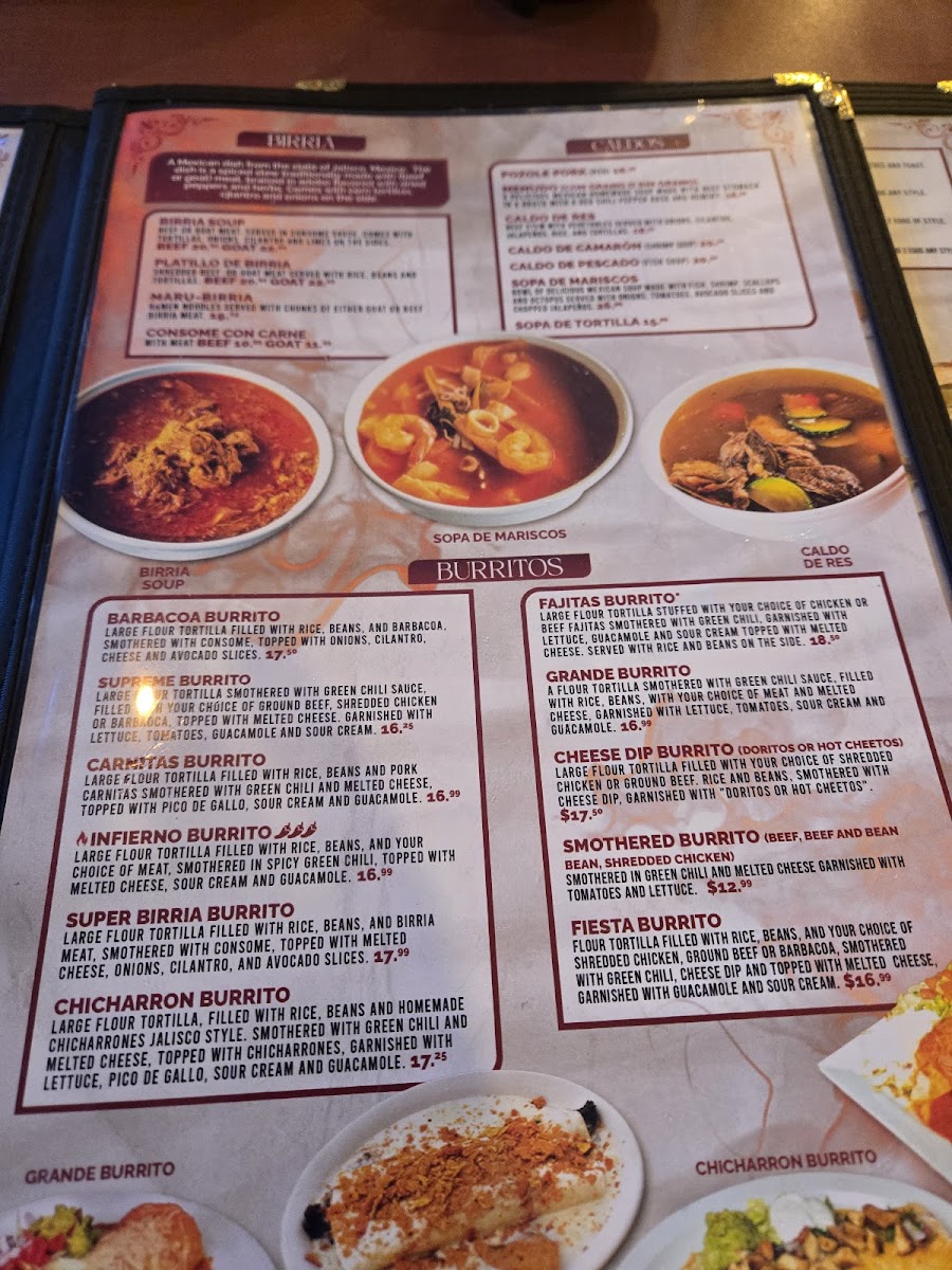 Large flour tortilla filled with rice, beans, and barbacoa, smothered with consomme, topped with onions, cilantro, cheese and avocado slices.